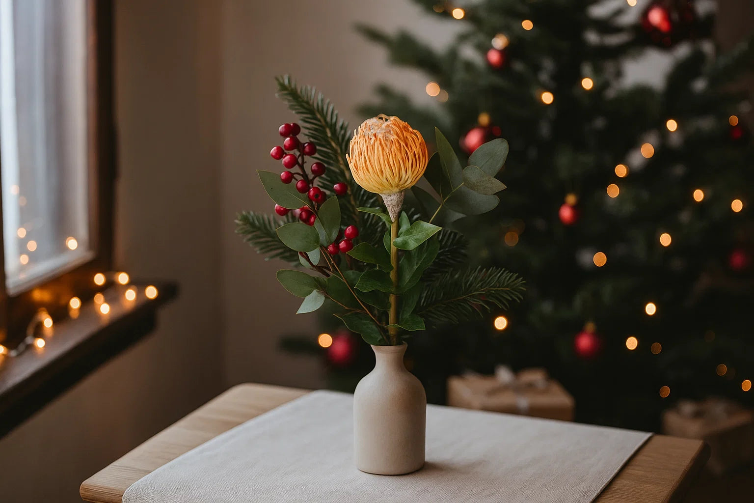 Composez un bouquet d’hiver moderne avec des proteas, pampas, leucadendrons ou feuillages sombres