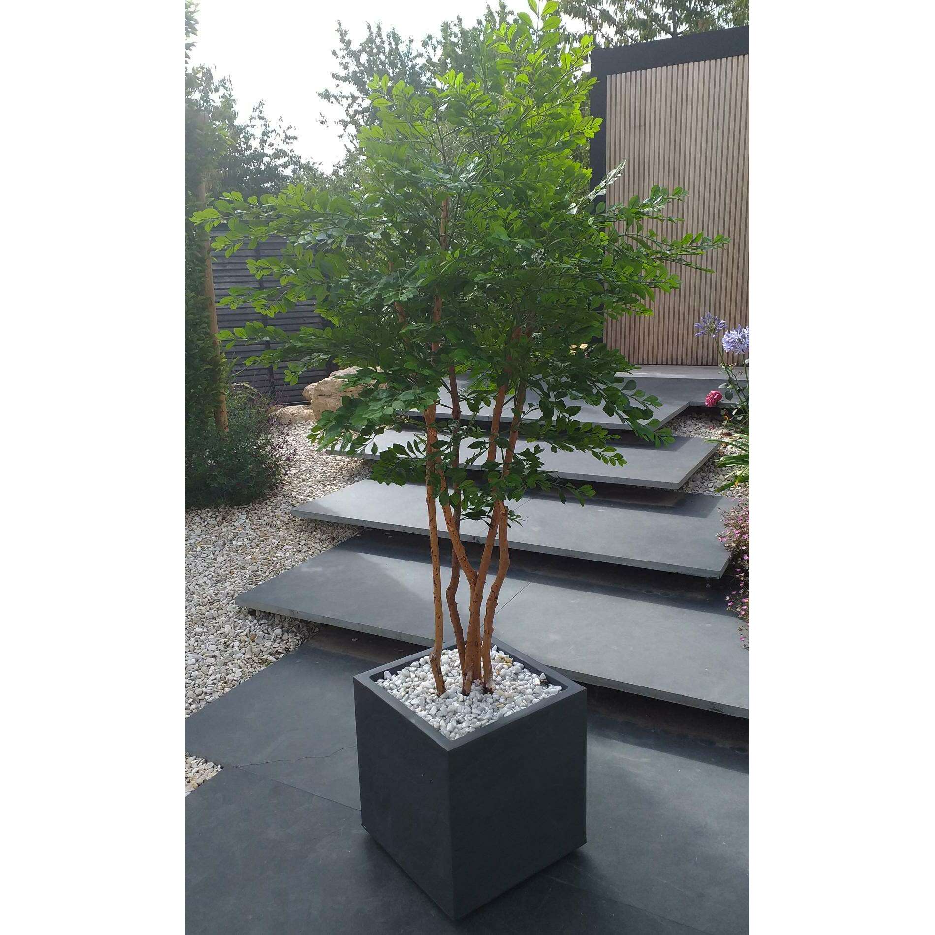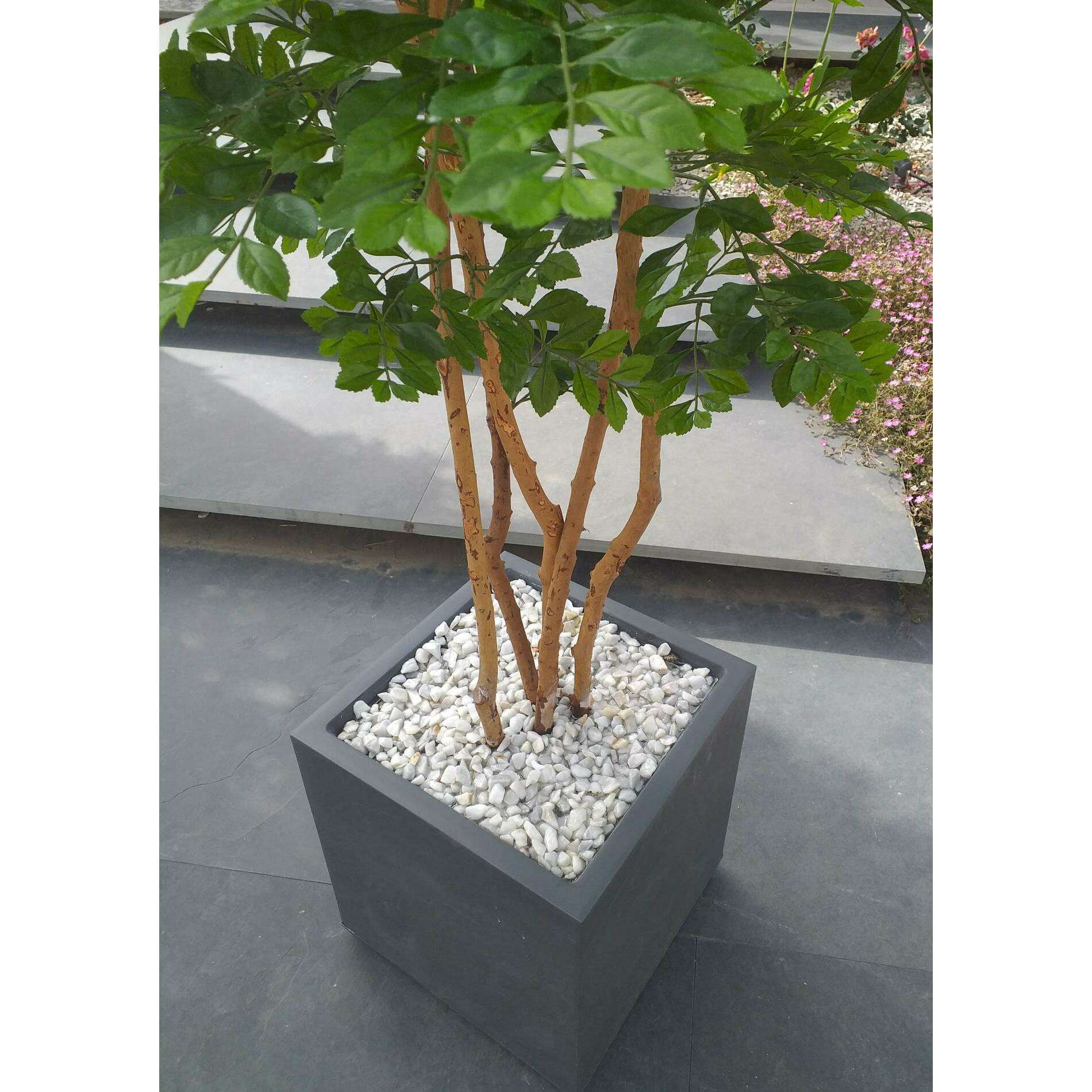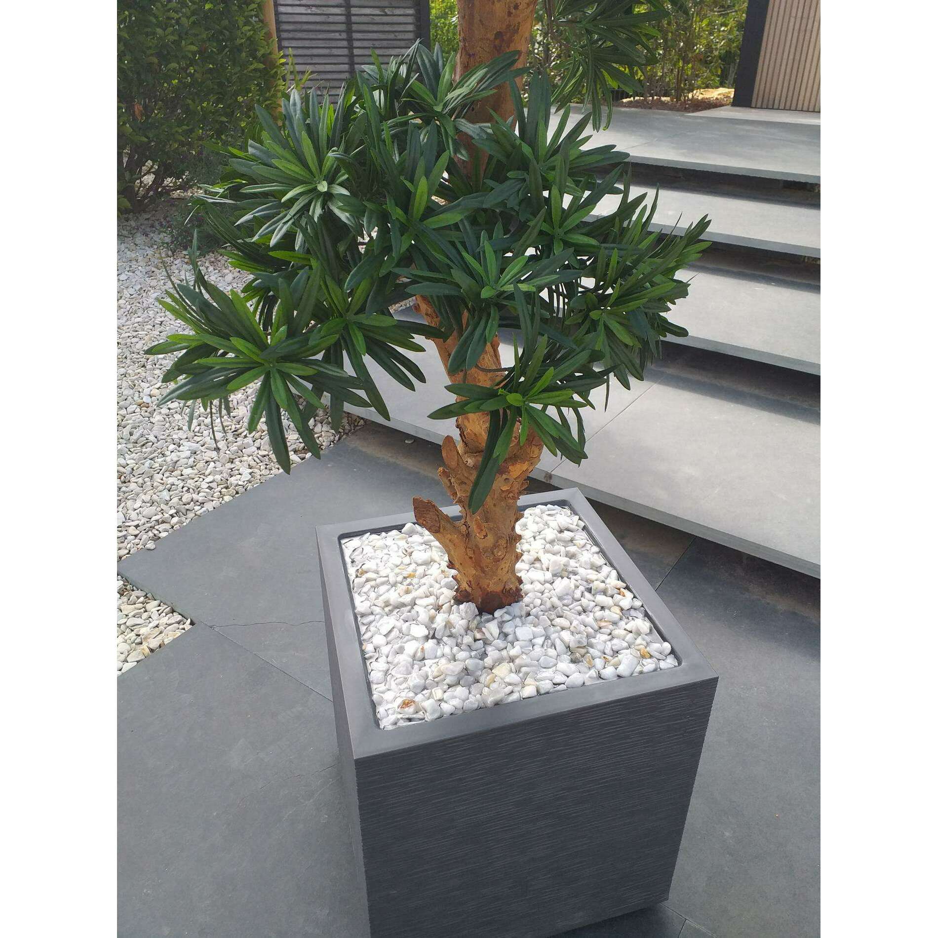 En amont, la qualité des articles sélectionnés par vos soins est vérifiée par nos experts de la végétation artificielle. Le bac est mis en condition pour accueillir l'arbre artificiel haut de gamme. La fausse plante est calée puis scellée dans le contenant par nos spécialistes de l'aménagement floral pour garantir une fixation rigide. Puis une finition marbre blanc concassé ou billes d'argile est réalisée pour un rendu prestigieux.