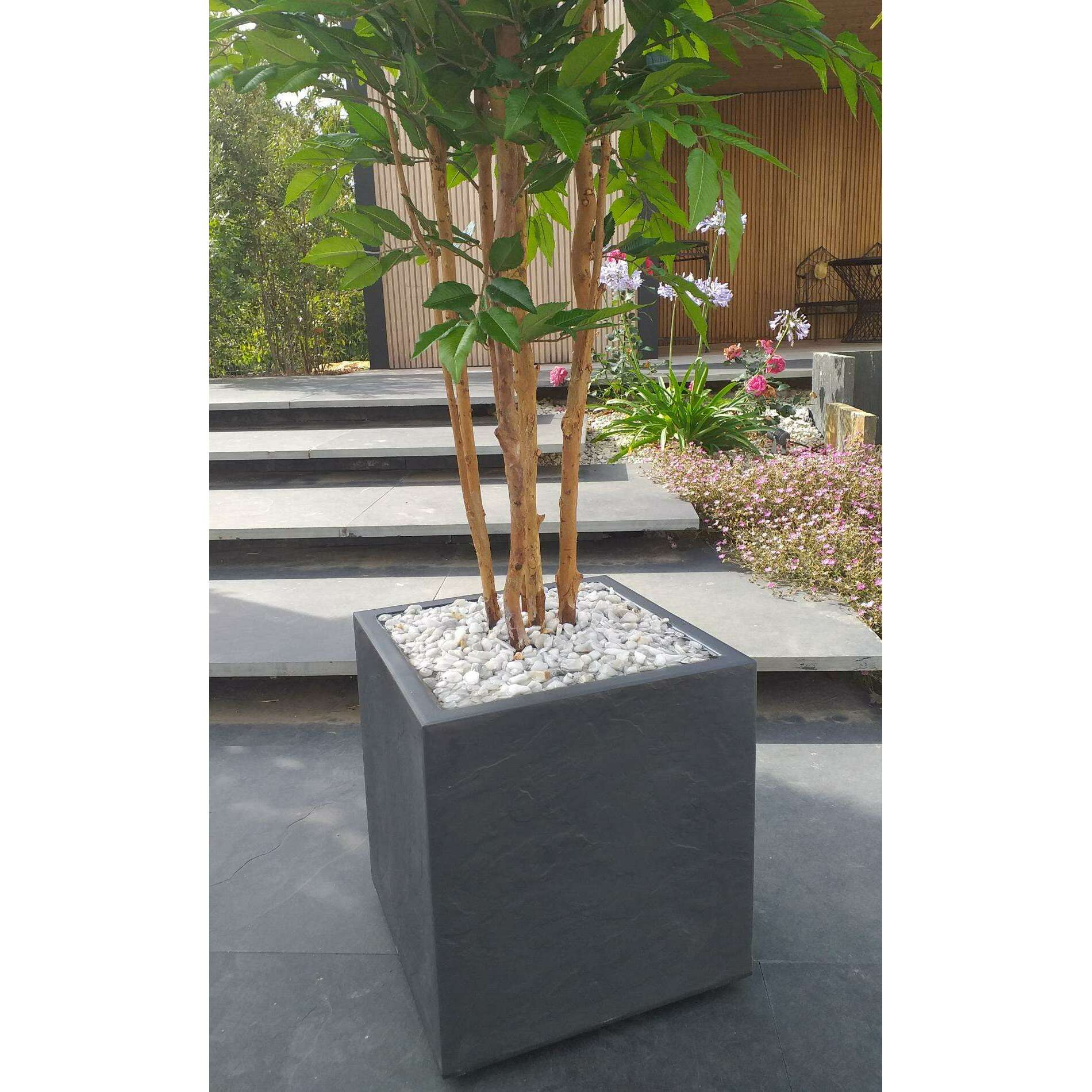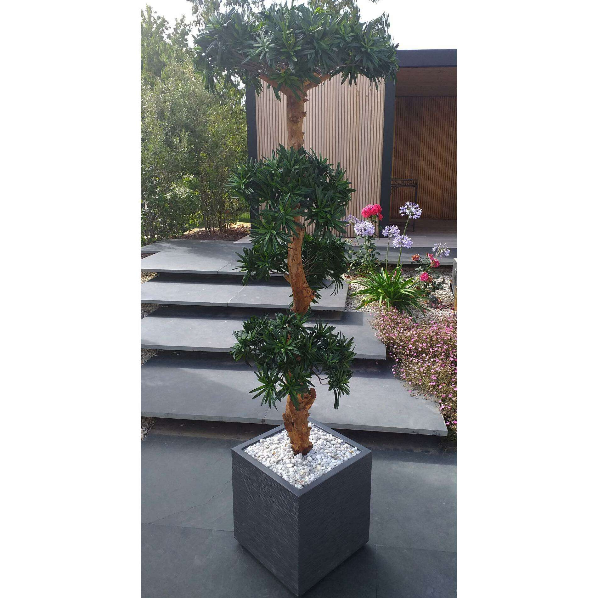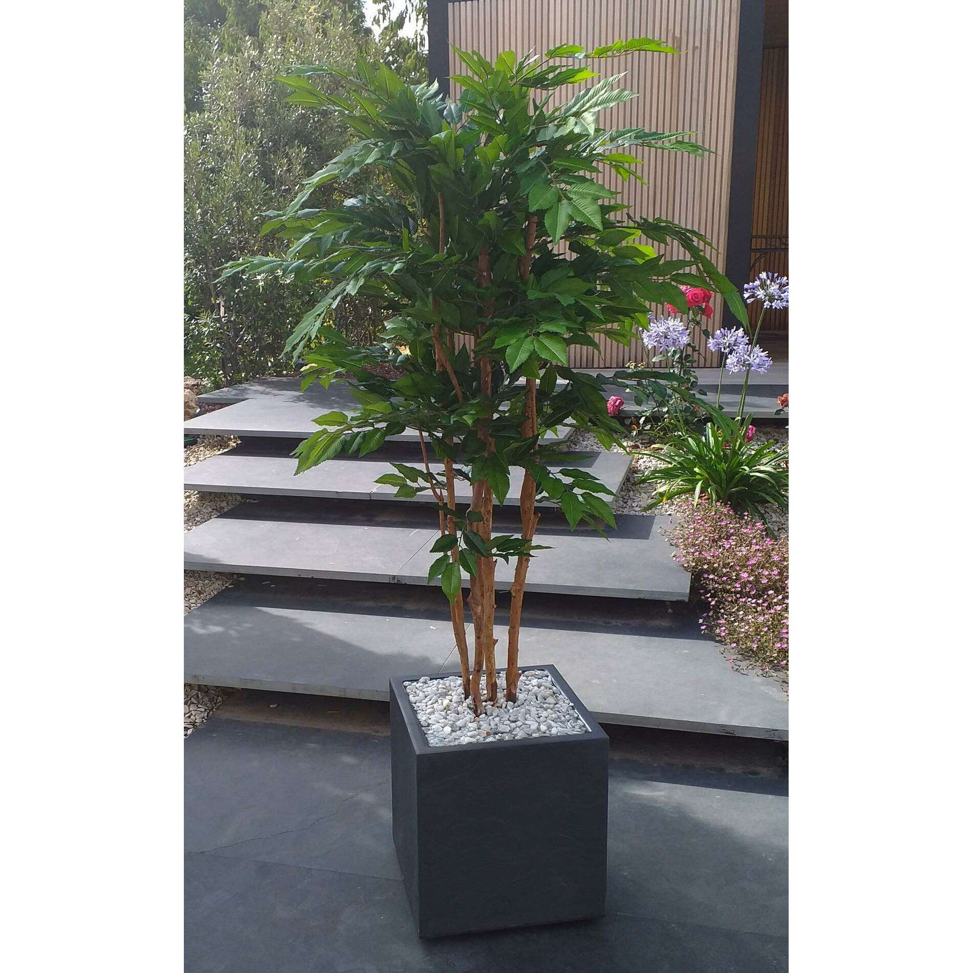 En amont, la qualité des articles sélectionnés par vos soins est vérifiée par nos experts de la végétation artificielle. Le bac est mis en condition pour accueillir l'arbre artificiel haut de gamme. La fausse plante est calée puis scellée dans le contenant par nos spécialistes de l'aménagement floral pour garantir une fixation rigide. Puis une finition marbre blanc concassé ou billes d'argile est réalisée pour un rendu prestigieux.